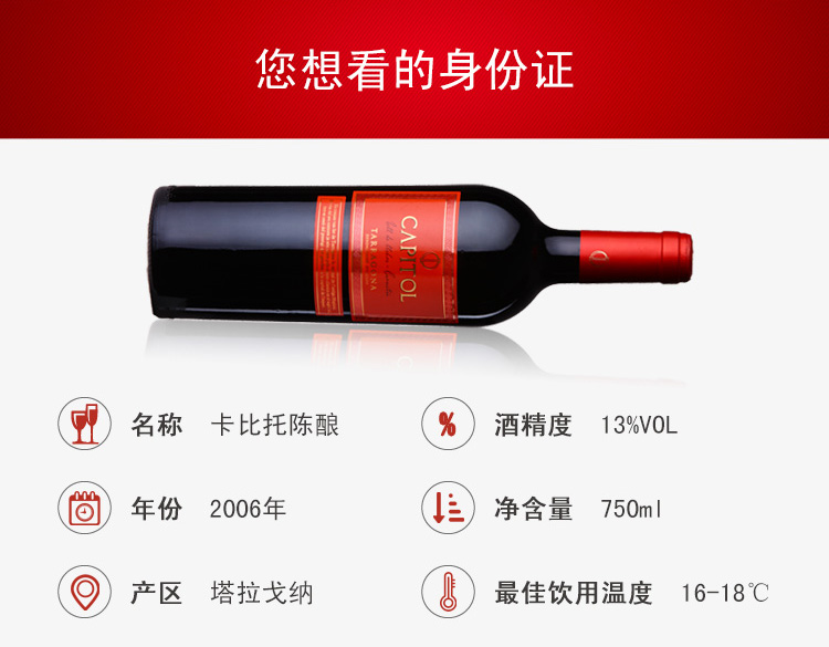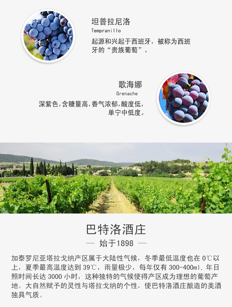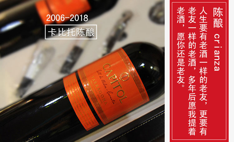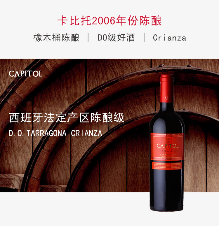 西班牙卡比托陈酿DO干红葡萄酒(crianza) ¥ 790.00 此款采用坦普拉尼洛和歌海娜混合酿制, 呈现诱人的深宝石红色, 成熟的红色水果与橙子清香交织融合, 散发着柔和温馨的芳香。 且含有香草和肉桂甜嫩的同时, 还混合了暗暗的可可味、咖啡与橡木树脂味, 瞬间充满活力的清香充斥您的唇齿间, 给您一种独特、愉快的回味。 适合搭配红烧肉、牛排、鸡、鸭等肉类菜肴。 葡萄年份: 2006年 产地: 西班牙 产区: 塔拉戈纳 最佳饮用温度: 16℃--18℃ 原料及辅料: 葡萄汁、二氧化硫 酒精度: 13%vol 葡萄品种: 坦普拉尼洛、歌海娜 等级: 西班牙法定产区陈酿级(D.O. TARRAGONA CRIANZA) 贮藏条件: 阴凉、避光、卧放 灌装商: 巴特洛酒庄 净含量: 750ml 产品详情 产品属性
