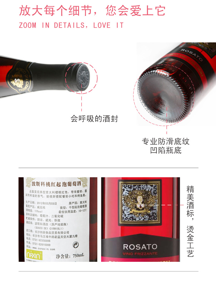 意大利波斯科桃红起泡葡萄酒 ¥ 158.00 此款选用美乐和拉波索混合酿制, 呈现诱人的樱桃红色, 香气清新迷人,圆润而和谐, 带有新鲜红莓和优雅的花香, 口感柔和、酒香浓烈、极易入口, 微甜微涩的入口感, 回味不绝, 是一款个性十足,精致而又特别的佳酿, 适合搭配意大利面、意式调味饭、烤鱼和青菜等清淡菜肴。 产地: 意大利 产区: 威尼托 最佳饮用温度: 10℃--12℃ 原料及辅料: 葡萄汁、二氧化硫 酒精度: 11%vol 葡萄品种: 美乐(Merlot)、拉波索(Raboso) 贮藏条件: 阴凉、避光、卧放 灌装商: 波斯科酒庄 产品详情 产品属性